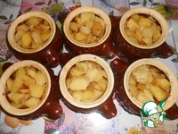 Картошку также разложить по горшочкам и залить бульоном по 200 мл в каждый. Далее долить кипяченой водой до нужного объема - чтобы бульон слегка виднелся из-под картошки. |