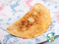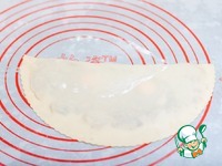 Накройте второй половинкой, аккуратно прижмите ладонью, выжимая воздух, прочно прижмите край полукруга и обрежьте лишнее при помощи тарелки или фигурного резака для пиццы. |