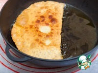 В сковороду с толстыми стенками наливаем 200-250 мл растительного масла, разогреваем его и обжариваем чебуреки на среднем огне с одной стороны |