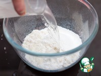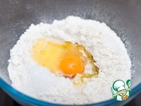 В другую миску просеять 300 гр муки, добавить яйцо, соль, сахар, водку, растительное масло и оставшуюся горячую воду. Перемешать. |