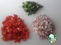 Помидоры, лук нарезаем также кубиком, петрушку не мелко шинкуем |