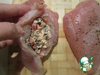 Используя острый короткий нож, прорежьте в филе "карман". Аккуратно наполните филе начинкой и скрепите разрез шпажкой. |