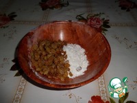 Распаренный изюм обсушиваем, выкладываем в чашку и добавляем немного муки. Перемешиваем. |