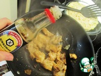 На большом огне обжарить лук, имбирь и свинину. Добавить соевый соус Kikkoman и черный перец. Жарить, постоянно помешивая, около 2ух минут. |