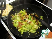 Добавить в сковороду капусту и острый перец. Обжаривать еще 2-3 минуты. |