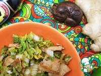 Тонко нарезать свинину и имбирь (прямо с кожурой). Также нарезать лук, капусту. Очень мелко порезать острый зеленый перец, хотя это уже дело вкуса. |