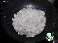 Курицу нарезать на кусочки, добавить соль и вино и мариновать 1 час. |