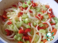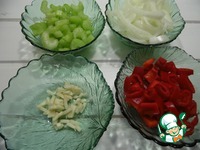 Перец нарезать небольшими кубиками, чили - колечками, сельдерей - небольшими кусочками, лук - полукольцами, чеснок измельчить |