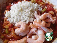 Креветки отварить и почистить, вместе с рисом выложить к овощам, перемешать. |