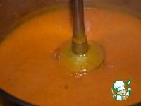 Взбить блендером до пюреобразного состояния. Вернуть кастрюлю с супом на плиту (если суп вам покажется слишком густым, добавьте немного воды) |