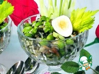 Салат украсила пёрышками зелёного лука, листочками и стеблями сельдерея. |