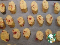 Охлажденное тесто нарежьте острым ножом на кусочки толщиной 1 - 1.5 см., положите на противень. Выпекайте в разогретой до 180 градусов духовке до легкого золотистого цвета. |