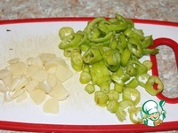 Огурцы замачиваем на 2-3 часа в холодной воде, после моем и обсушиваем. Чеснок нарезаем тонкими пластинами. Перчик чили очищаем от семян, нарезаем тонкими кольцами. |