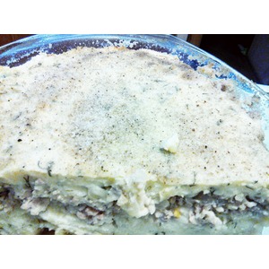 Картофель очистить, отварить, воду слить. Отваренный картофель размять, добавив горячее молоко, масло, соль, яйца, сделать пюре. Можно добавить также немного укропа (по желанию). Разделить пюре на две части, первую часть выложить в форму, смазанную маслом и присыпанную сухарями, разровнять. Фарш обжарить с луком, солью, черным перцем, выложить на первый слой пюре и разровнять. Сверху выложить оставшееся пюре, разровнять, сбрызнуть маслом или смазать сметаной. Поставить в горячую духовку и готовить 30 минут. При подаче на стол можно посыпать немного зеленью.