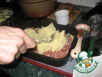 Форму смазываем маслом и выкладываем слоями: пюре, фарш. Выкладывать лучше тонкими слоями, так фарш быстрее приготовится. Последним слоем должна оказаться картошка. |