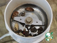 Измельчить в кофемолке мускатный орех, гвоздику, душистый перец, смесь перцев, кардамон и корицу. |