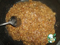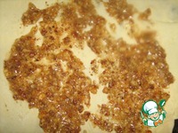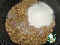 Тем временем, заняться начинкой: орехи подсушить в духовки и растолочь скалкой до крупинок. Всего понадобиться 1,5 стакана размолотых орехов. Всыпать 1,5 стакана сахара и влить 4 белка. |