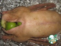 Завернуть гуся в 2 слоя фольги. Уложить на большой противень. Разогреть духовку до 200 градусов. Отправить гуся в духовку на 1 час. |