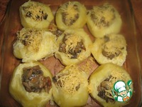 Чайной ложкой заполнить выемки в картофеле грибной начинкой. Присыпать тертым на средней терке сыром. |