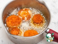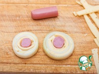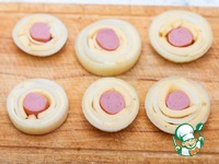 Вот так должно получиться. Эти 6 колец получились с одной луковицы. Сыр и сосиска должны держаться в луке плотно, тогда они не будут выпадать при панировке. |