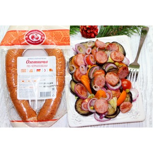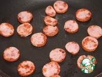 Колбасу полукопченую Охотничью нарезать колечками. |