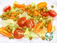 Далее зеленый горошек и помидоры черри. Горошек вполне заменим на фасоль. |