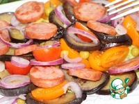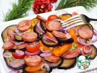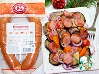 Теплые колесики колбасы и лук. Полить заправкой. |