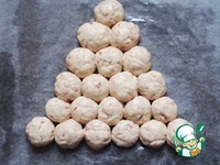 Далее от теста отщипывать кусочки, сформировать шарики величиной чуть больше грецкого орешка и выложить на противень, застеленный бумагой для выпечки и смазанный оливковым маслом, в виде елочки. |