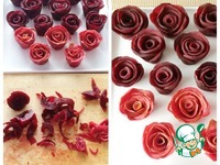 Как приготовить розы из свеклы и яблок я уже писала в своем рецепте торта "Миллион алых роз". Кого заинтересовало такое оформление, может посмотреть http://www.povarenok .ru/recipes/show/126 704/ |