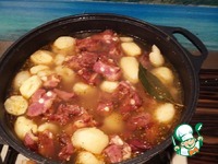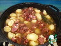За счет того, что хрящи хорошо режутся, нарезаем их такими кусками, какими нам больше нравится и перекладываем в тушилку. Туда же очищенный картофель одновременно. Заливаем водой и ставим на огонь. |