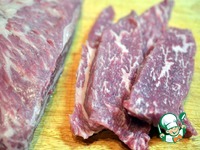 Мясо нарезать на полоски толщиной 5 мм (поперек или вдоль волокон, значения не имеет). У меня мраморная говядина. |