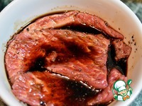 Поместить мясо в маринад, перемешать так, чтобы мясо со всех сторон было покрыто маринадом, накрыть пищевой пленкой и поставить в холодильник на 6-8 часов. |