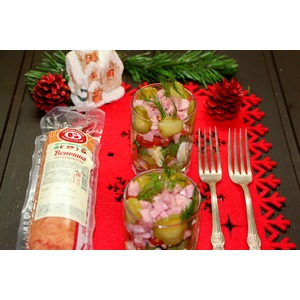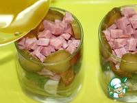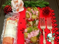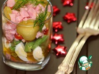 Описание: Не люблю когда на праздничном столе стоят полупустые салатники. Как удобно подавать порционно, пусть даже не в креманках, а в самых обычный стаканах. Этот салат давно пользуется успехом в нашей семье. Яркий, не утяжеленный слишком калорийными ингредиентами. Довольно простой, но он порадует вас своим вкусом.
