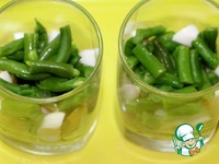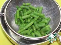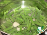 Стручковую фасоль отварить (2-3 минуты после закипания) с добавлением чеснока, который потом удалить. |