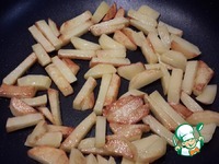 Пока рыба закипает, обжариваем до золотистой корочки, но не до готовности, картошку на сковороде. Имменно она, обжаренная "спрячет" "рыбный дух". |