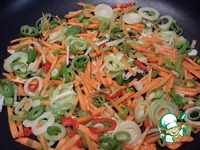 Теперь обжариваем на оливковом масле овощи: нарезанный кольцами порей, соломкой морковь, колечками перец чили (без семечек!) |