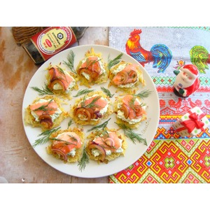 Описание: Очень симпатичная и вкусная закуска на драниках, с творожным кремом и форелью, с маринованным, крымским луком в соевом соусе KIKKOMAN (натурально сваренный).