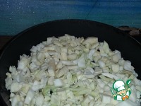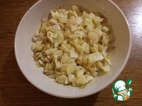 Нарезаем капусту кубиками примерно 1,5 на 1,5 см, примерно вот так и ставим на огонь обжаривать в сковороде. |