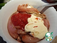 Филе заливаем соевым соусом. Перемешиваем. Добавляем горчицу, кетчуп, майонез. |