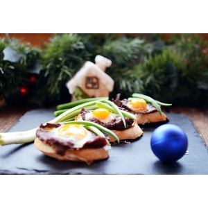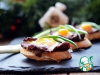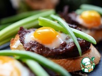 Описание: Сытная и красивая закуска! Нежный кусочек жареной говядины с глазуньей из перепелиного яйца - и всё это на хрустящих ломтиках багета. Отличное решение для фуршета и просто для праздничного стола!