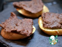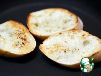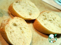 Пока мясо маринуется, нарежем багет. Кусочки должны быть ровными, чтобы потом, когда Вы положите сырое яйцо, желток не скатывался. |
