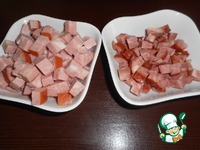 Колбасу, режем кубиками (я использовала - копчённую колбасу, ветчину куриную) |