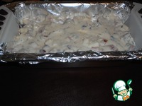 В форму для выпечки выкладываем тесто. Форму (у меня форма размером 23*13*7) можно смазать растительным маслом, можно застелить пекарской бумагой, фольгой. (ей я и воспользовалась) |