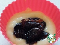 Чернослив замочите в ликёре на 2 часа. В формочки выложите половину теста, затем ягодку чернослива и остальное тесто. |