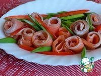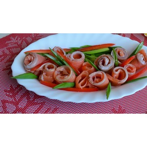 Нарезать тонкими полосками острым ножом, выкладывать на блюдо, скрутив розочкой или другим способом. Украсить зеленью. |