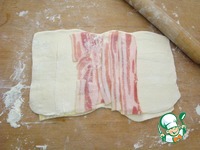 В центр внахлёст выкладываем грудинку вот таким образом. У меня были длинные кусочки и последний ряд я выложила из отрезанных кусочков с длины. Края теста перегибаем к центру. |