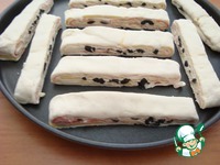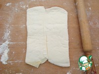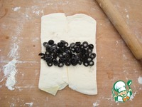 Опять по центру выкладываем теперь уж маслины порезанные. Опять перегибаем тесто к центру. Скалкой опять "приминаем". |