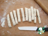 Получаем пласт шириной примерно 12 см, который нарезаем на слойки шириной 1,5-2 см. Получилось 10 шт. |