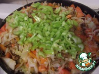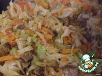 Теперь добавляем порезанный перец соломкой и всё это оставляем на плите ещё на 5 минут. В самом конце добавляем по вкусу соль и перец. Капусту закрываем крышкой и оставляем на плите на 2 минуты. |