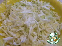 Капусту нужно порезать соломкой и немного посолить. Это нужно для того, чтобы капуста дала сок. |